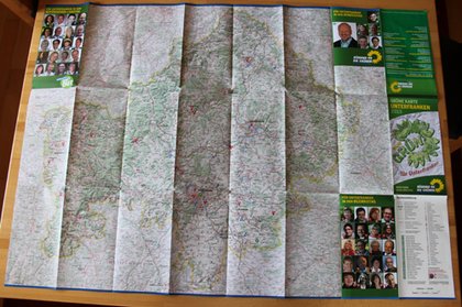Keine billigen Kugelschreiber oder Flaschenöffner - bei den unterfränkischen Grünen gibt es ab sofort eine nützliche Straßenkarte, "garniert" mit sämtlichen Grünen KandidatInnen des Bezirks für die Bundestags-, Landtags- und Bezirkstagswahl.